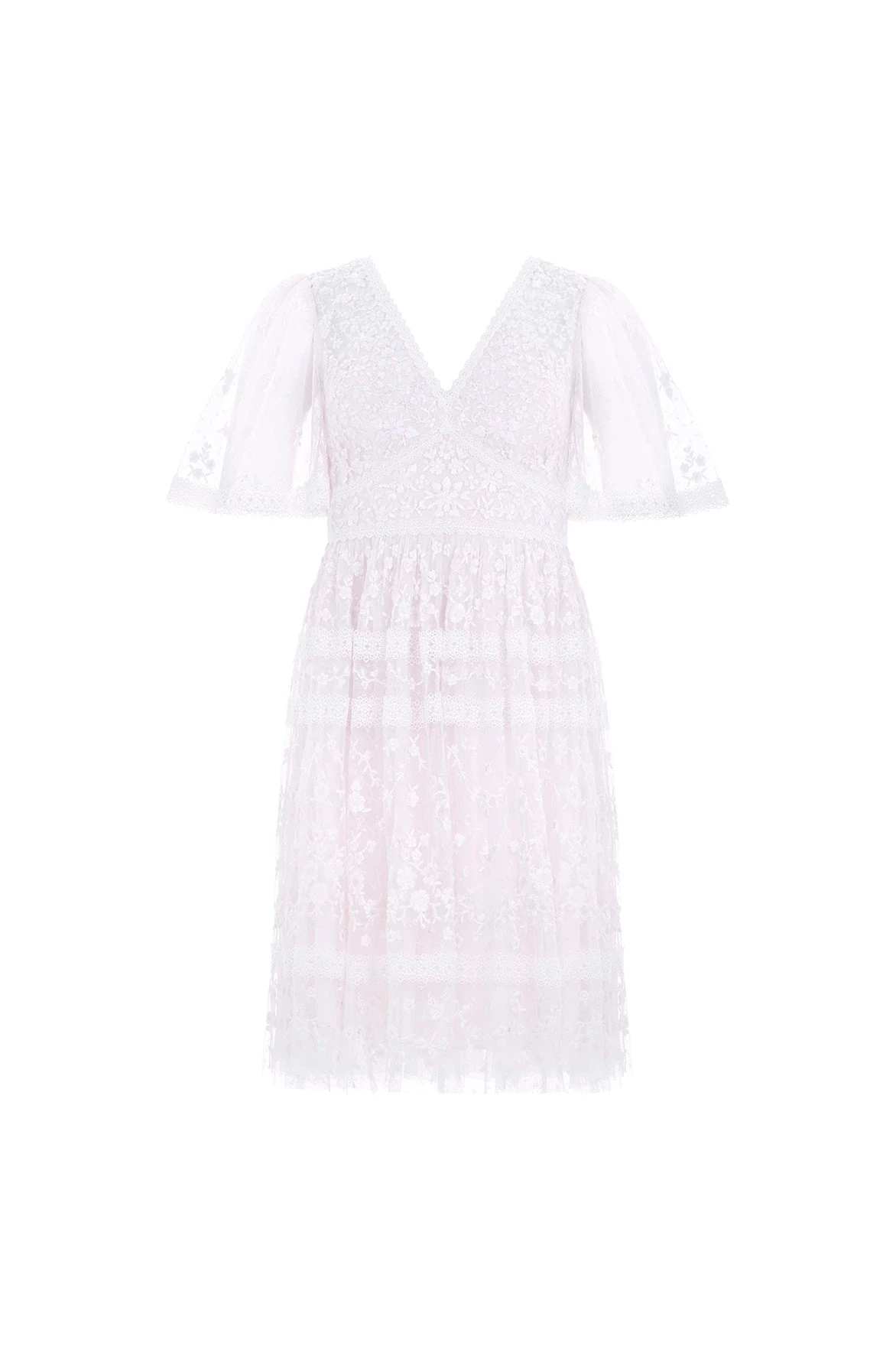 NEW SEASON. The Sweetheart Lace Mini Dress in Powder Pink/White. A signature Needle & Thread style. This mini dress is embroidered delicately with a floral lace artwork. Designed beautifully with intricate trimmed lace in pretty border motifs and perfectly positioned tiers through the skirt. Crafted from soft, kisses tulle creating a romantic texture throughout. The perfect dress to take you from day to night.