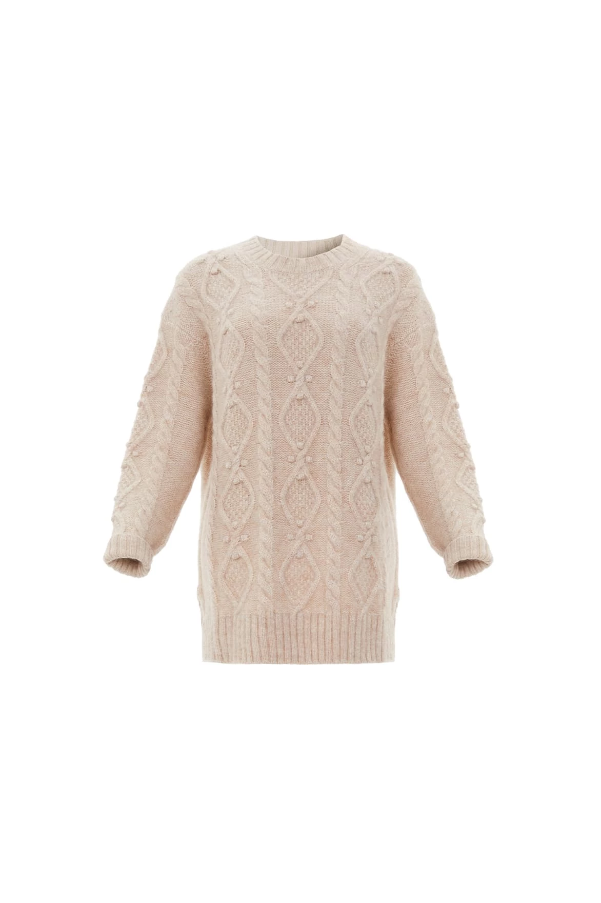 NEEDLE & THREAD EXCLUSIVE. The Sylvie Cable Longline Jumper in Birch. This premium knitwear piece is designed in a super-soft, fluffy alpaca-blend yarn. This cosy jumper is crafted with a mix of diamond-shaped cables and twists in an intricate textile. Adorned with playful flower bobbles adding a feminine texture. Designed with a relaxed fit, subtle split details and loose sleeves to create a cosy feel. The ultimate wardrobe staple this season.