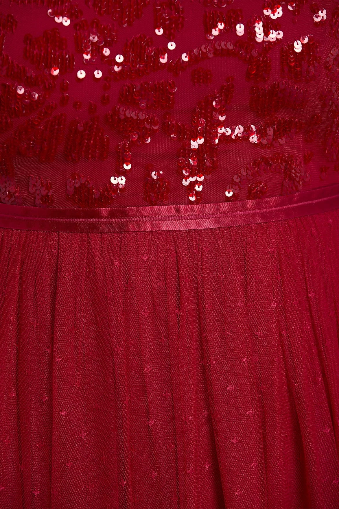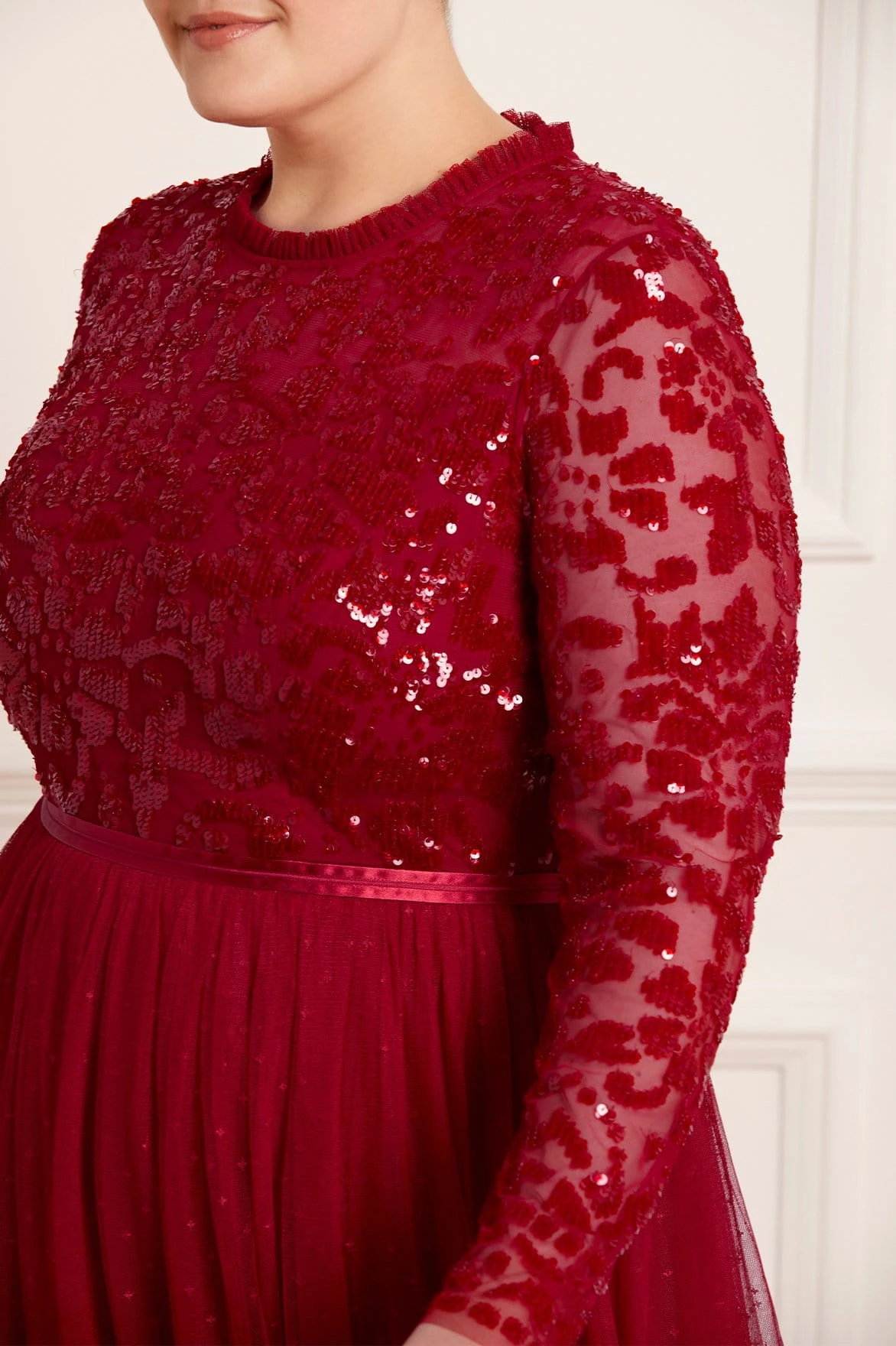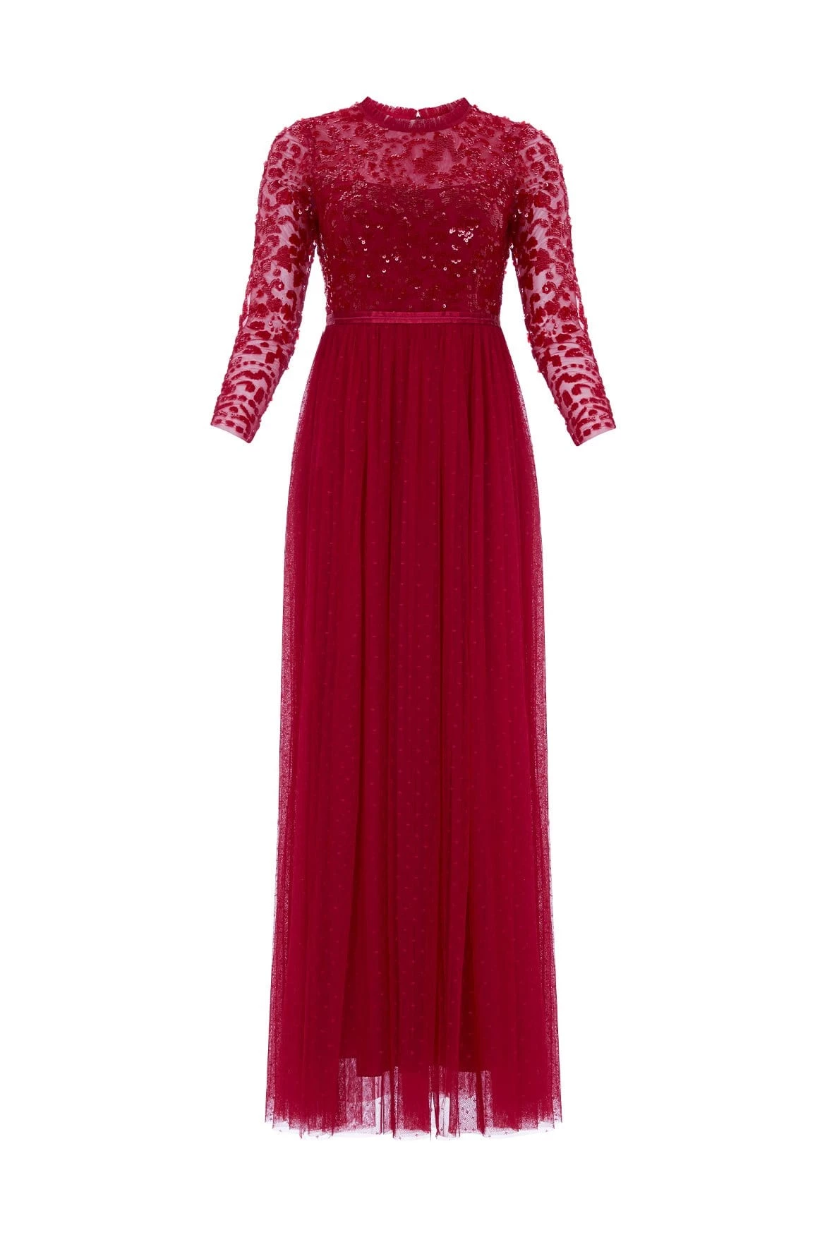 NEEDLE & THREAD EXCLUSIVE. The Tempest Bodice Ankle Gown in Deep Red. This beautiful gown is inspired by a vintage lace tablecloth design. Its bodice is adorned with sequins, creating an all-over shimmer effect. Crafted with long sleeves, a tulle multi-layered skirt and frill trim detailing around the neck. Make an entrance in the Tempest.