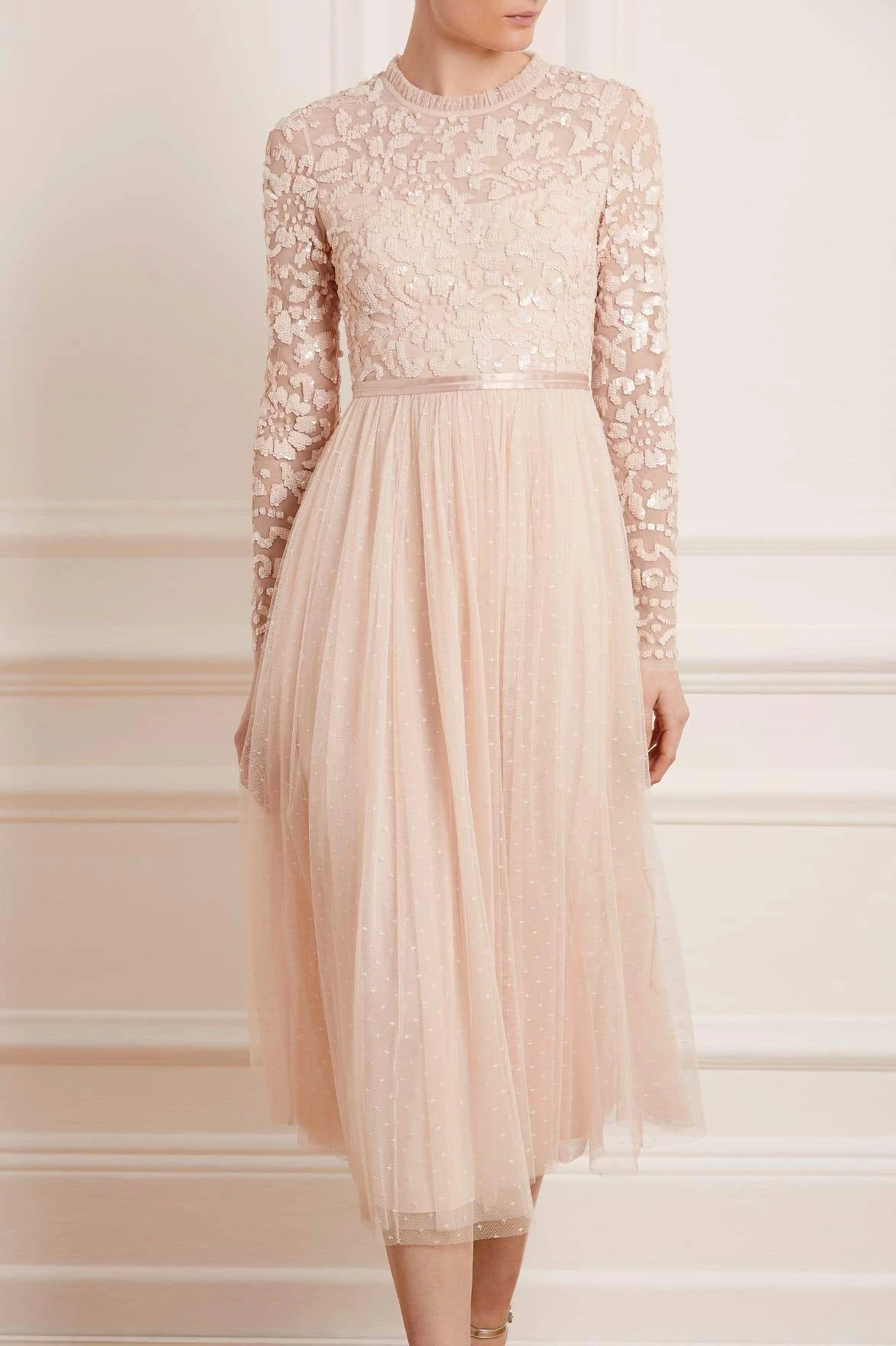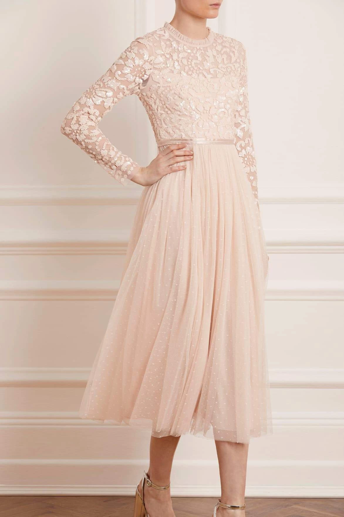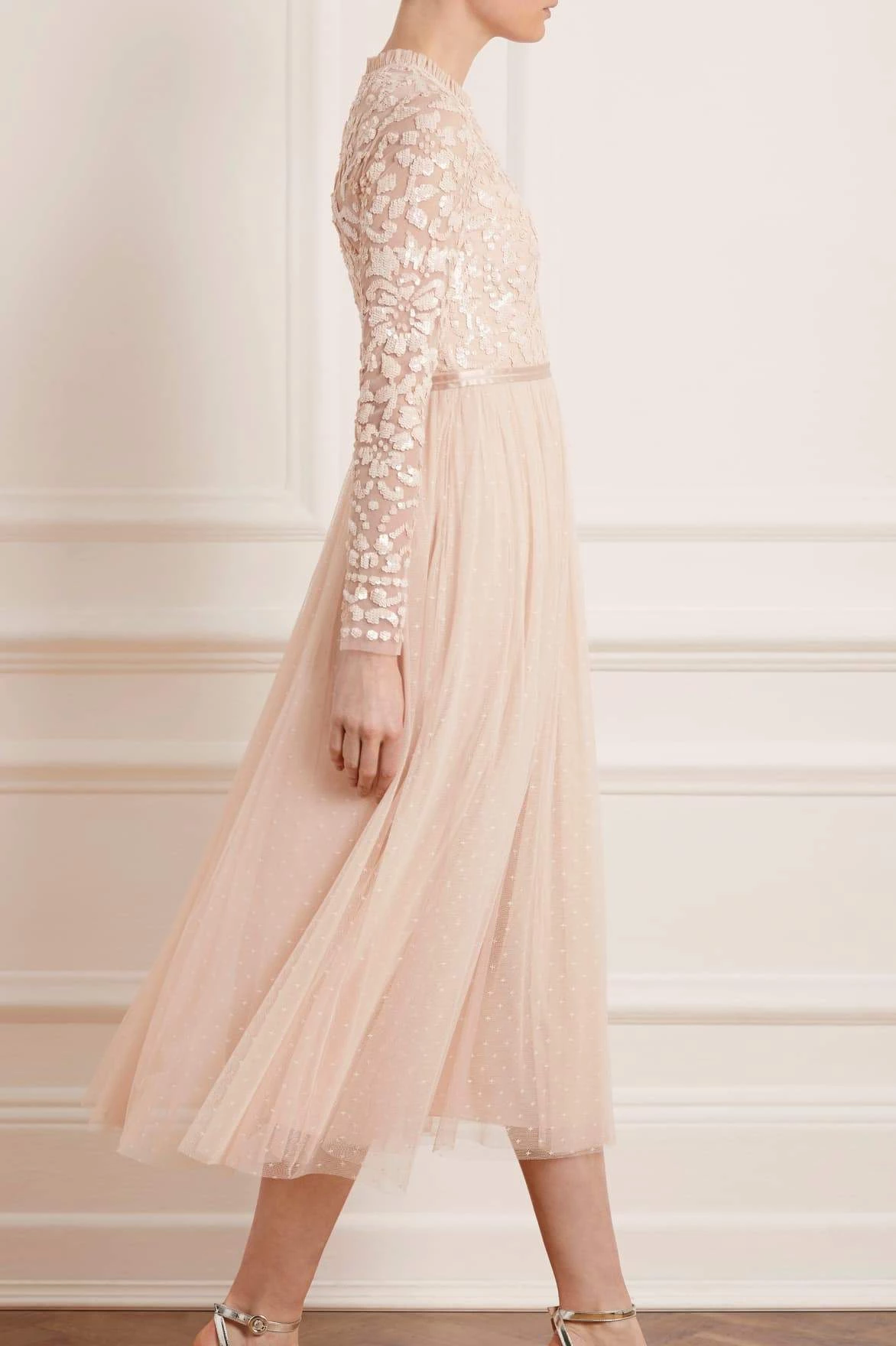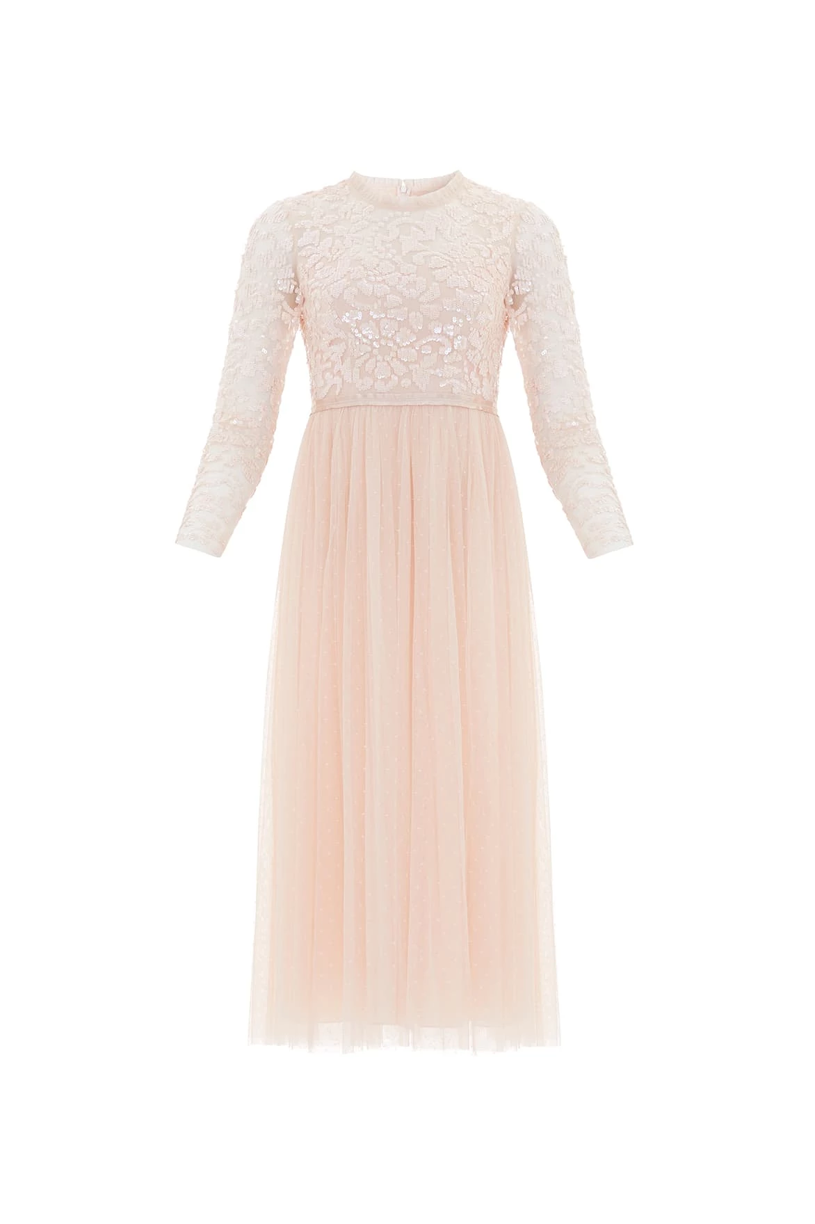 NEEDLE & THREAD EXCLUSIVE | The Tempest Bodice Ballerina Dress in Strawberry Icing. This beautiful ballerina dress is inspired by a vintage lace tablecloth design, embellished with shimmering pink sequins all over the bodice. Designed with long sleeves, a kisses tulle multi-layered skirt and frill trim detailing around the neck. Make an entrance in the Tempest.