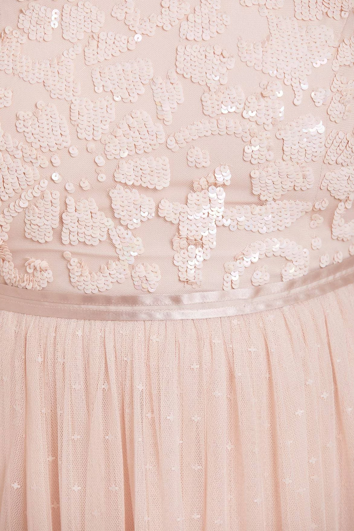 NEEDLE & THREAD EXCLUSIVE. The Tempest Bodice Gown in Strawberry Icing / Pink. Inspired by a vintage lace tablecloth design, this beautiful gown is embellished with shimmering sequins all over the bodice. Designed with long sleeves, a tulle multi-layered skirt and frill trim detailing around the neck. Make an entrance in the Tempest.