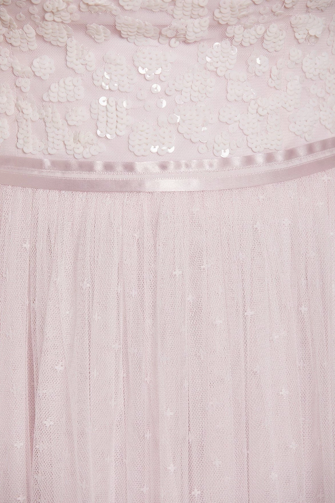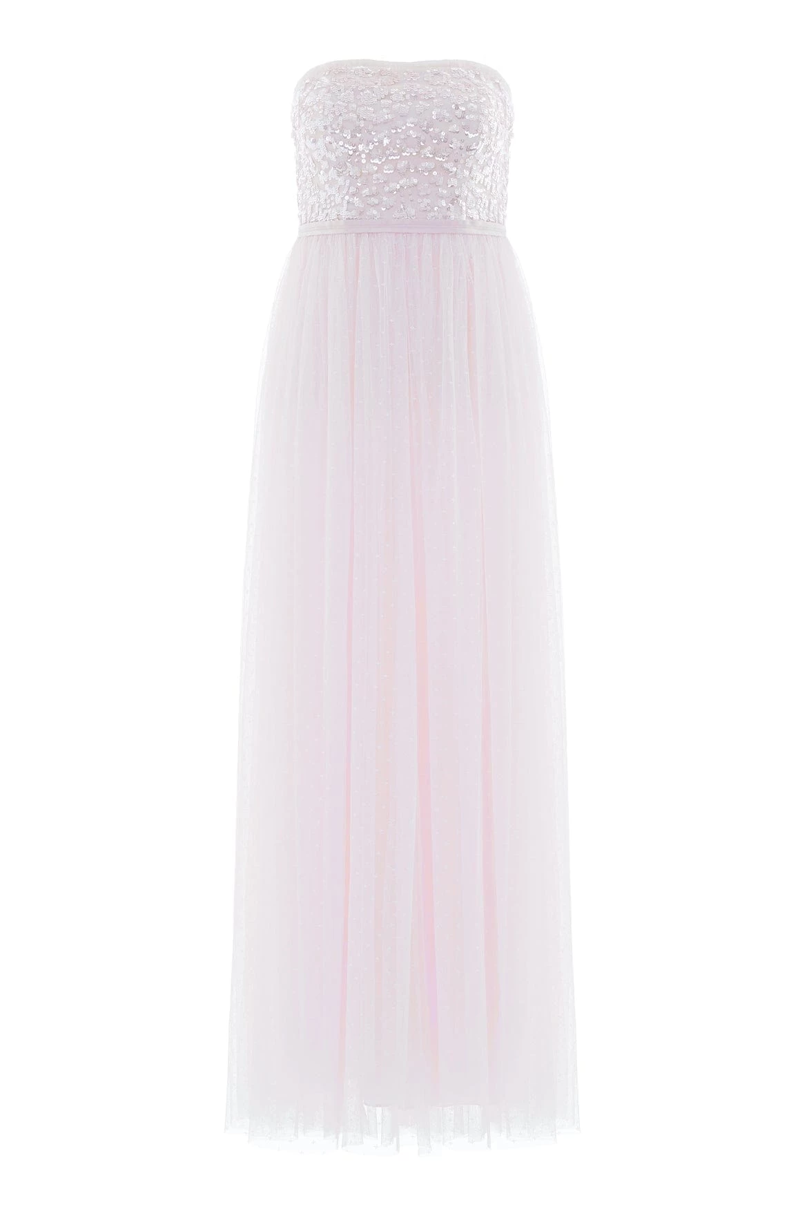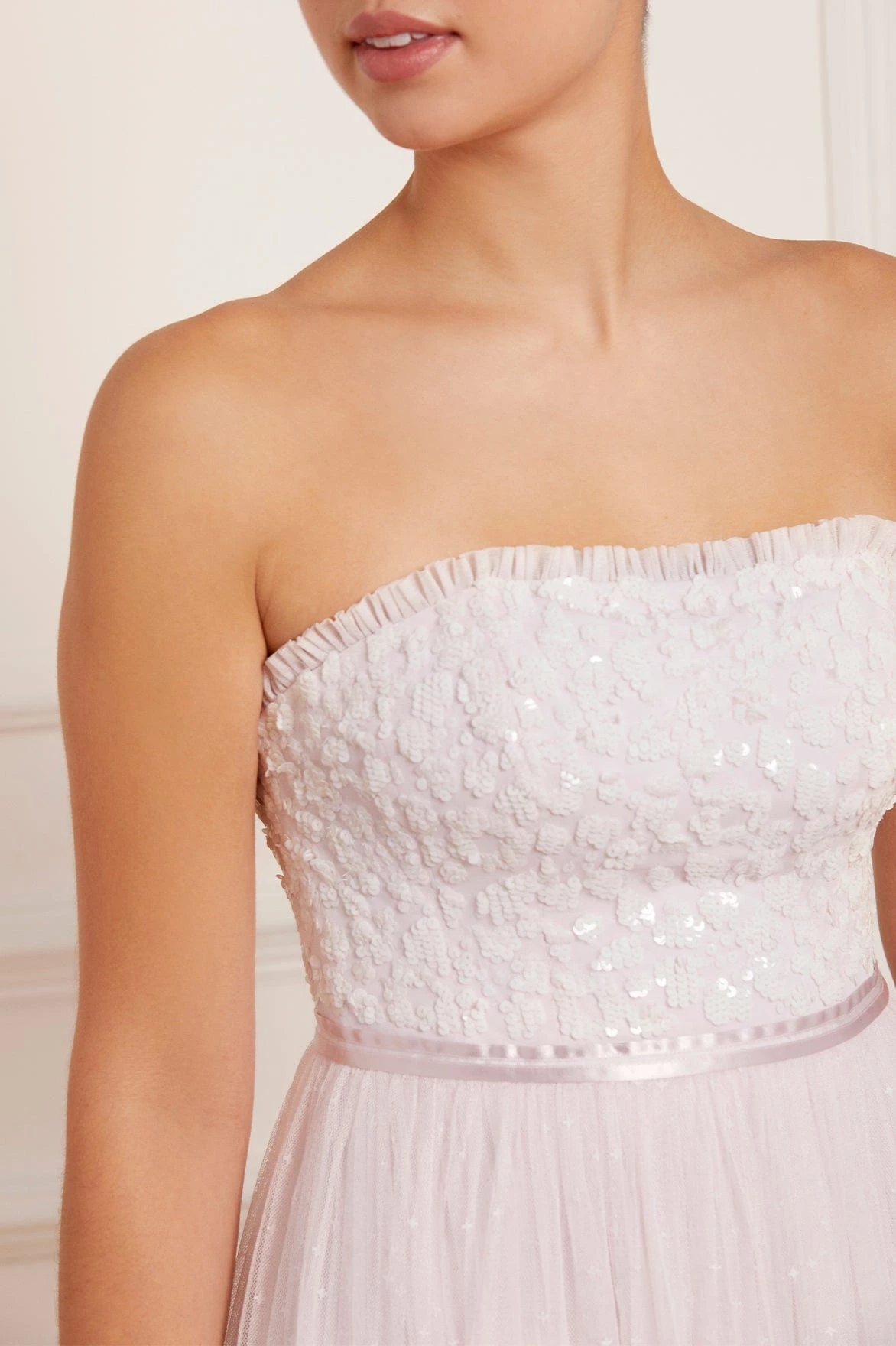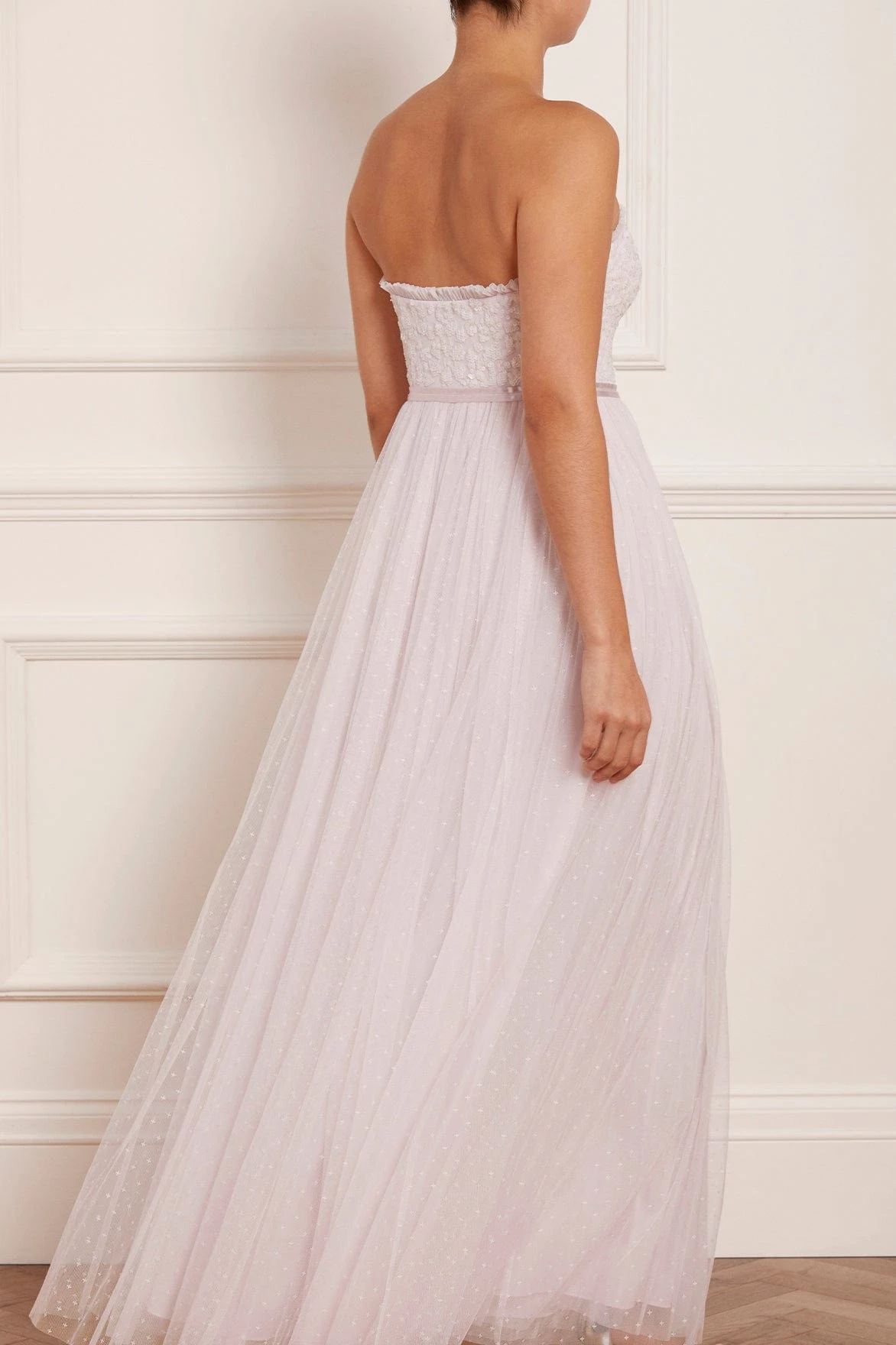 NEW SEASON. The Tempest Strapless Corset Bodice Gown in Powder Pink/White. The bodice of this gown is embellished with shimmering, iridescent sequins in romantic floral lace motifs. Designed with an integrated corset made with ribbon stitching, soft boning and panels of stretch mesh fabric for comfort and security in the fit. Crafted with layers of signature kisses tulle creating romantic movement as you walk. A true fairytale piece in the collection.