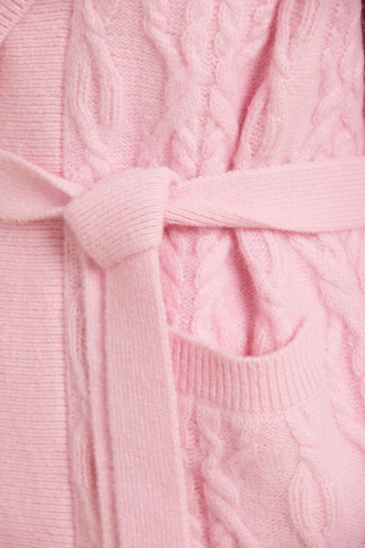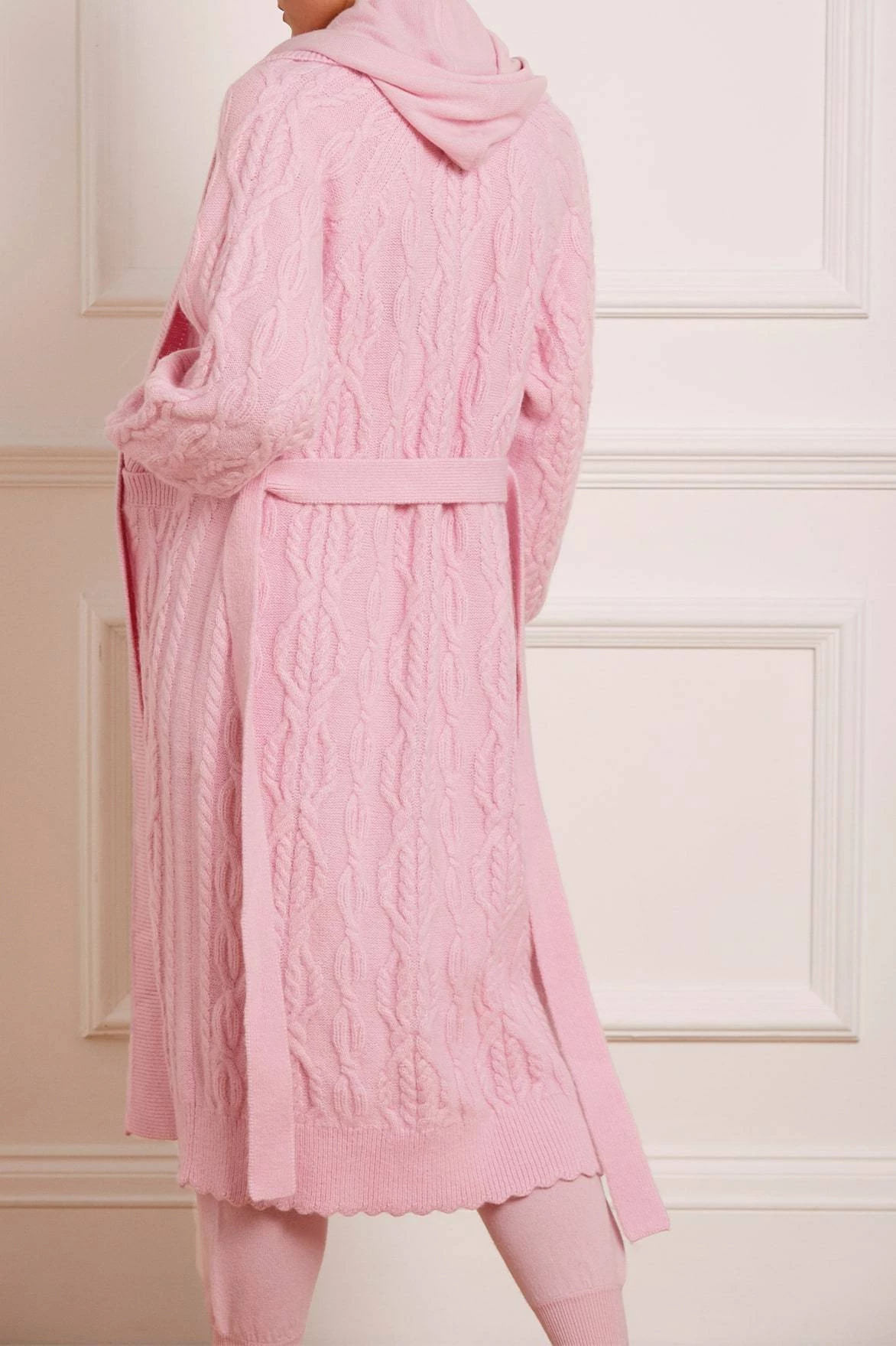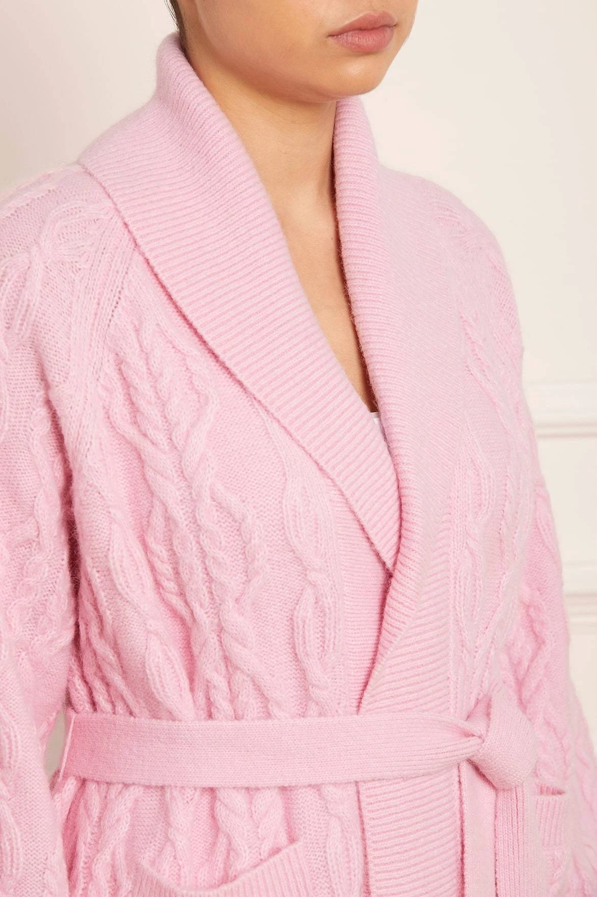 The Twisted Cable Maxi Cardigan in Soft Pink. This soft maxi cardigan is developed from alpaca yarn, creating a luxe, cosy feel and fluffy texture. Crafted with mixed cables in bold, oval shapes intricately intertwined throughout. Designed with voluminous sleeves, a belt for easy styling and pockets for the perfect finish. Beautifully adorned with a scallop edge on the hemline for signature Needle & Thread detailing. The perfect everyday piece.