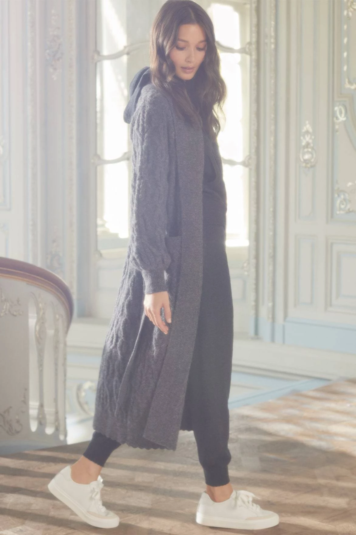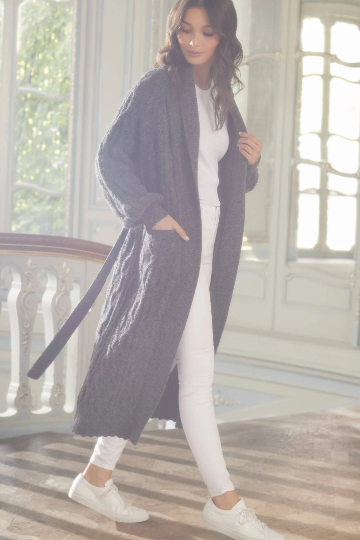 The Twisted Cable Maxi Cardigan in Graphite Grey. This soft maxi cardigan is developed from alpaca yarn, creating a luxe, cosy feel and fluffy texture. Crafted with mixed cables in bold, oval shapes intricately intertwined throughout. Designed with voluminous sleeves, a belt for easy styling and pockets for the perfect finish. Beautifully adorned with a scallop edge on the hemline for signature Needle & Thread detailing. The perfect everyday piece.