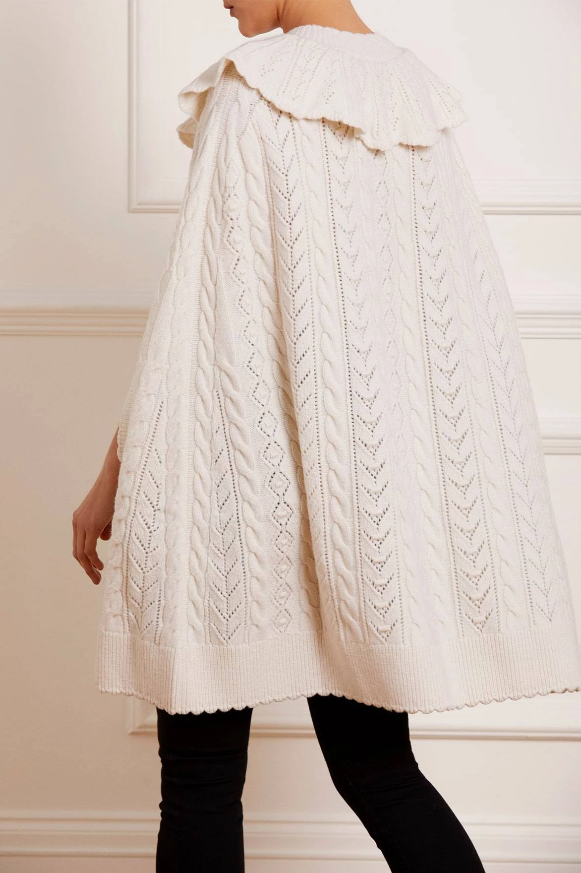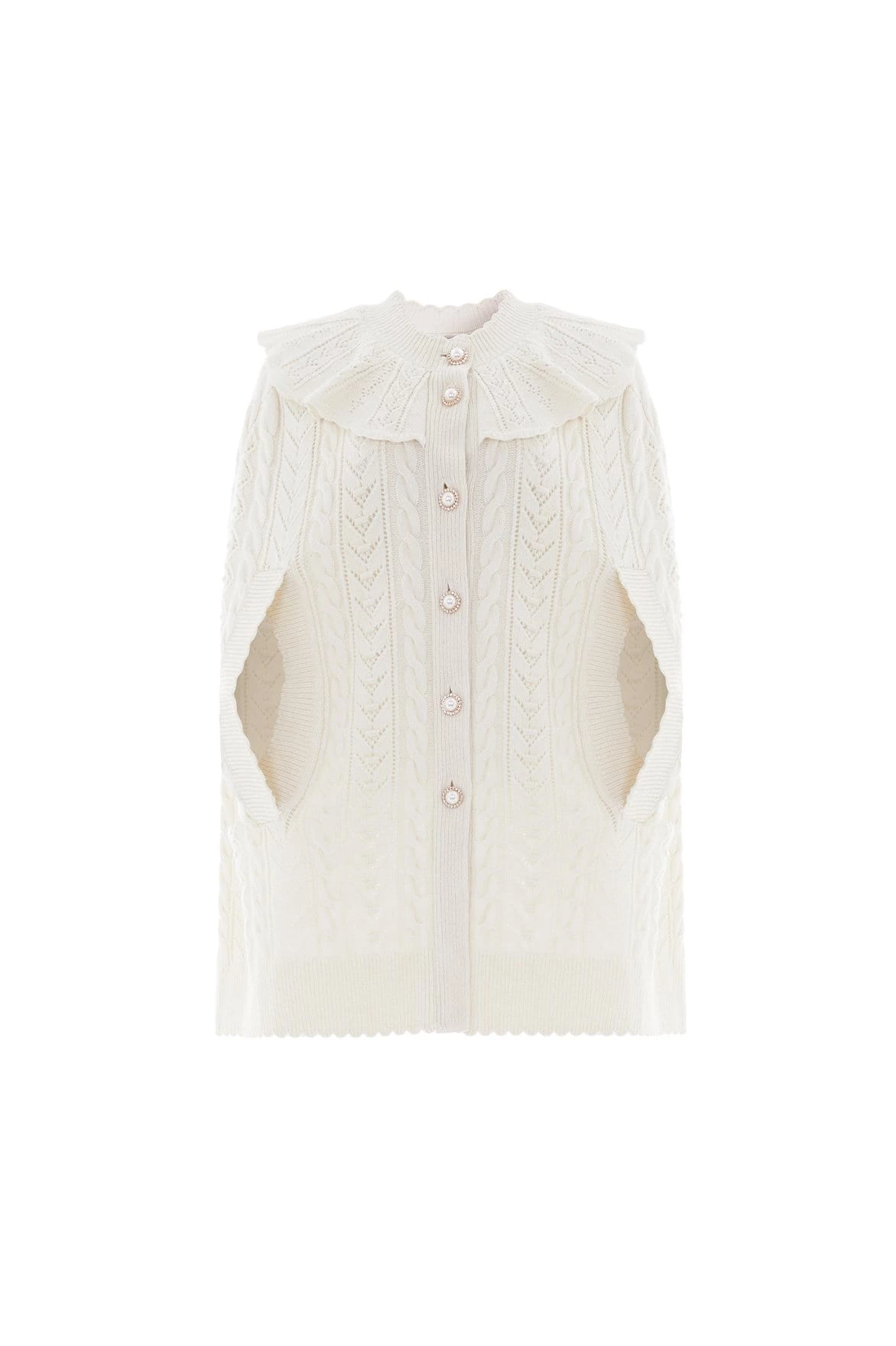 NEEDLE & THREAD EXCLUSIVE. The Victoriana Cape in Cream. This beautiful cape is made from soft wool and decorated with faux pearls and crystal-embellished buttons for a luxe finish. It features delicate stitches, mixed cables and bobbles. Make this feminine cape your new styling piece.