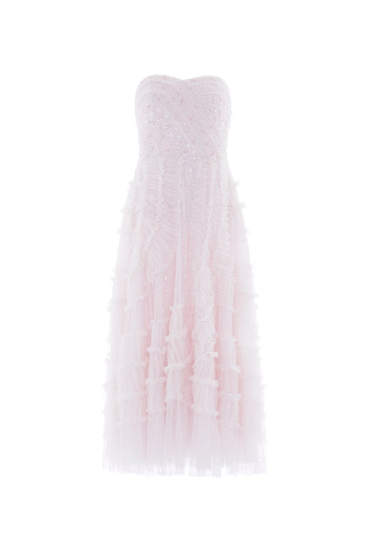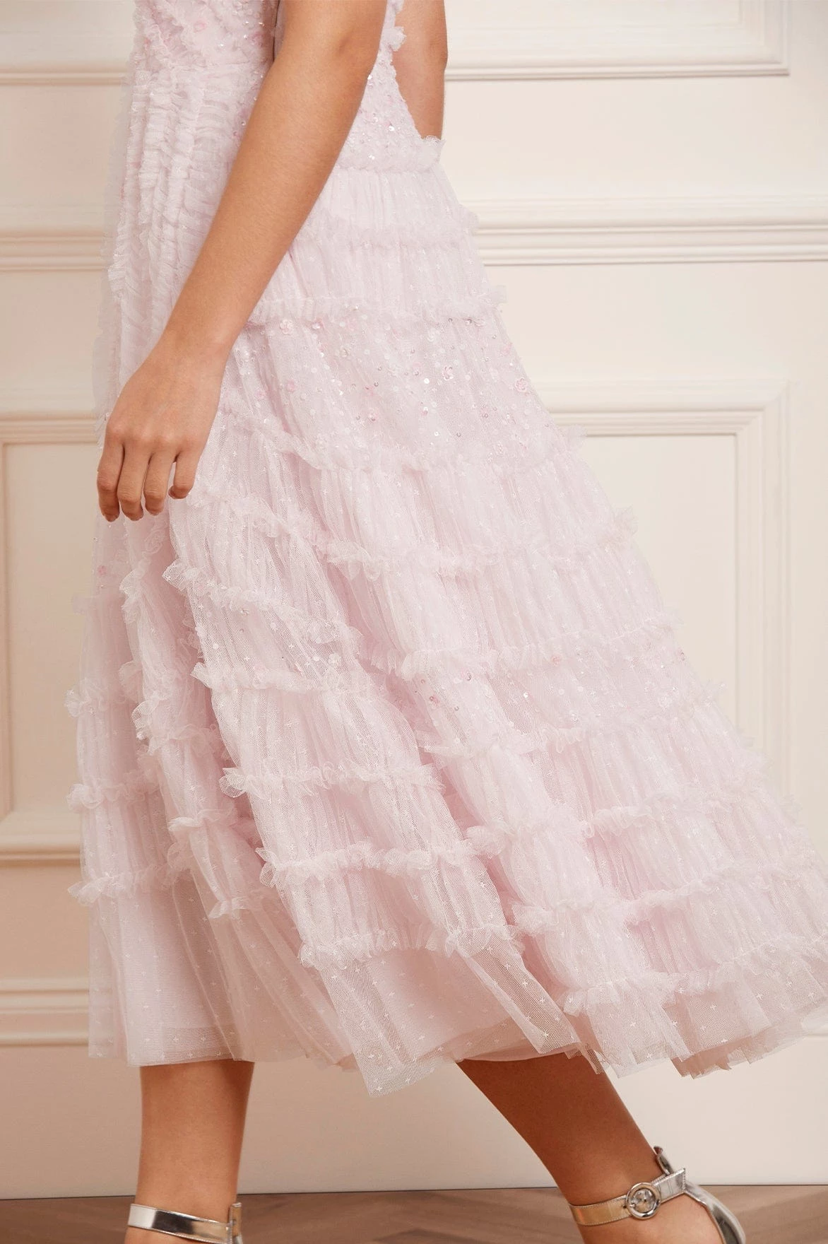 NEW SEASON | NEEDLE & THREAD EXCLUSIVE. The Violet Shimmer Strapless Corset Ballerina Dress in Powder Pink. This romantic dress is delicately scattered with a shimmering sequin artwork. The silhouette is beautifully adorned with double stitch ruffles creating a dramatic, sweeping statement. Designed with an integrated corset made with ribbon stitching, soft boning and panels of stretch mesh fabric for comfort and security in the fit. Developed from pretty, kisses tulle for signature Needle & Thread detailing. Shine under the spotlight in the Violet Shimmer.