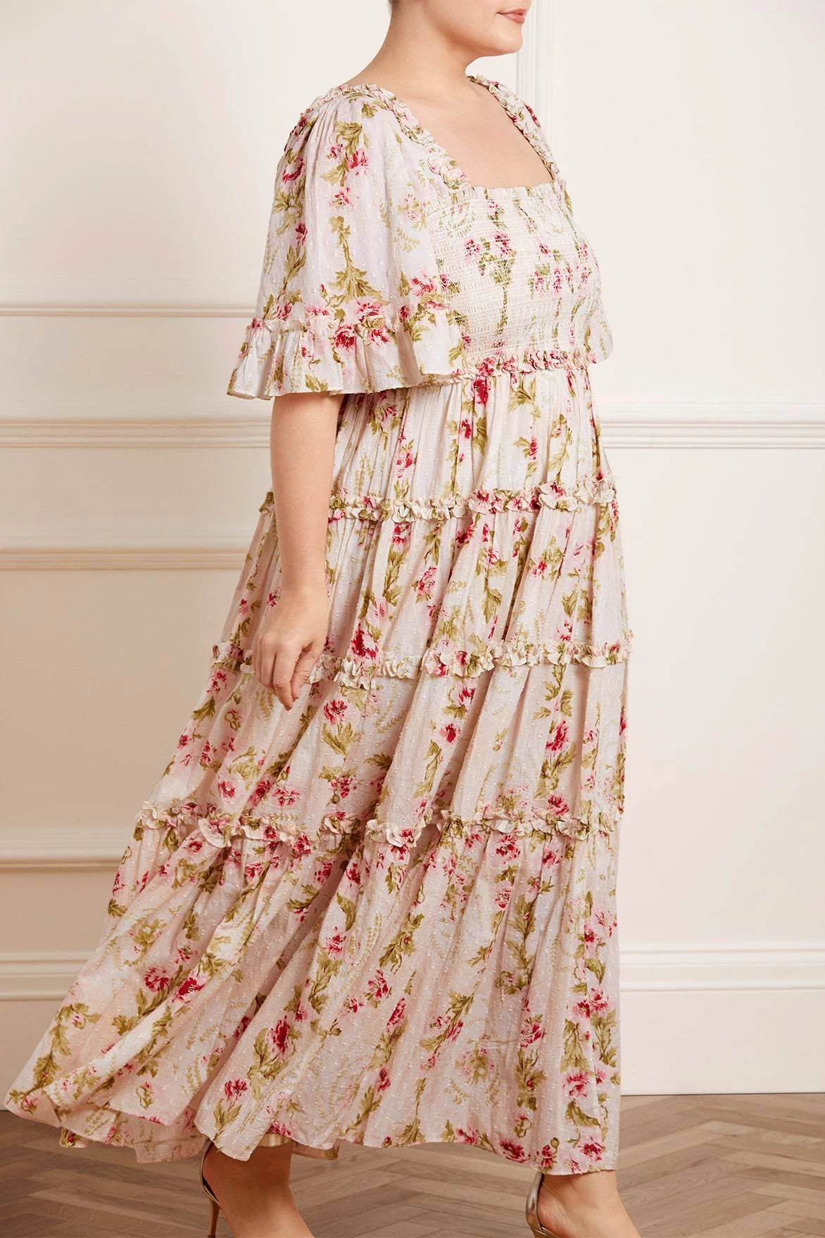 The Waltzing Blooms Cotton Smocked Ankle Gown. Beautifully printed with a rose and vine motif artwork, this gown features Needle & Thread’s bestselling silhouette, soft tulle frills and a signature satin waistband. Make a statement at your next occasion.