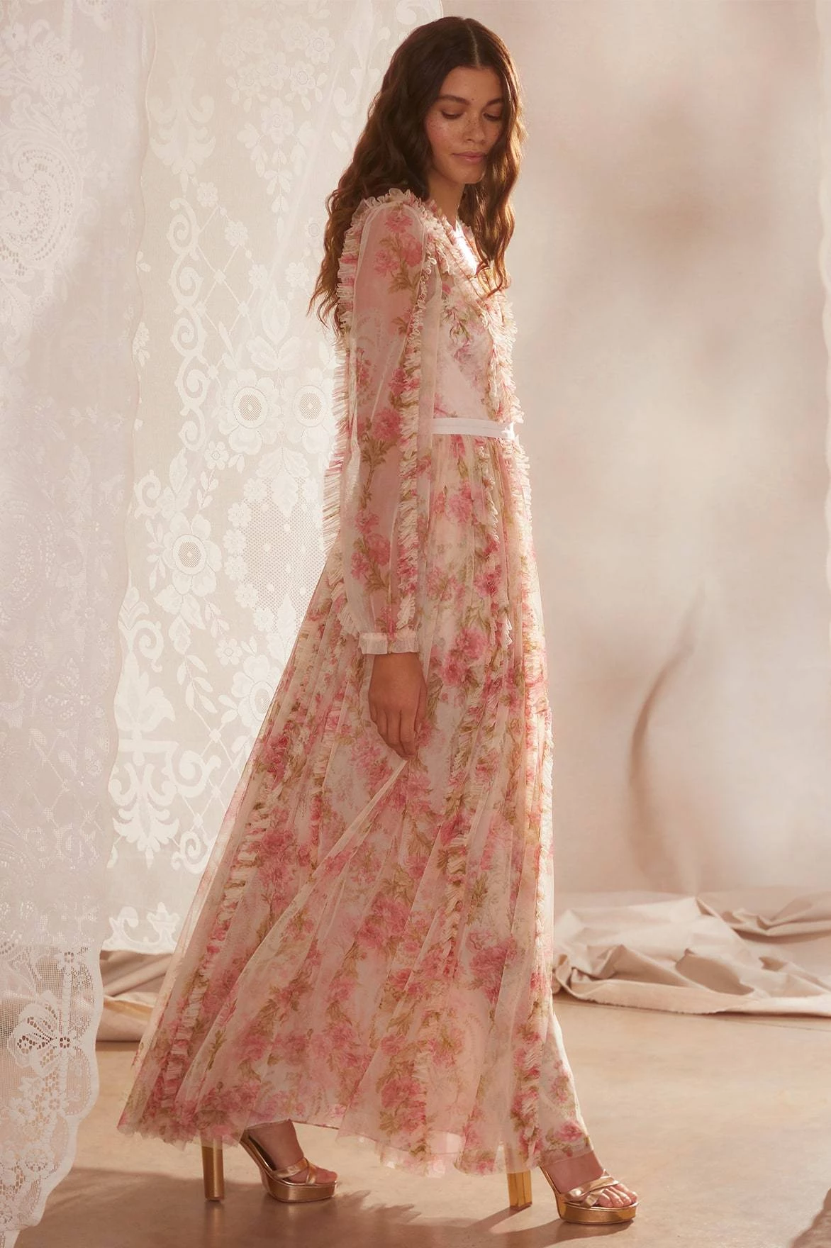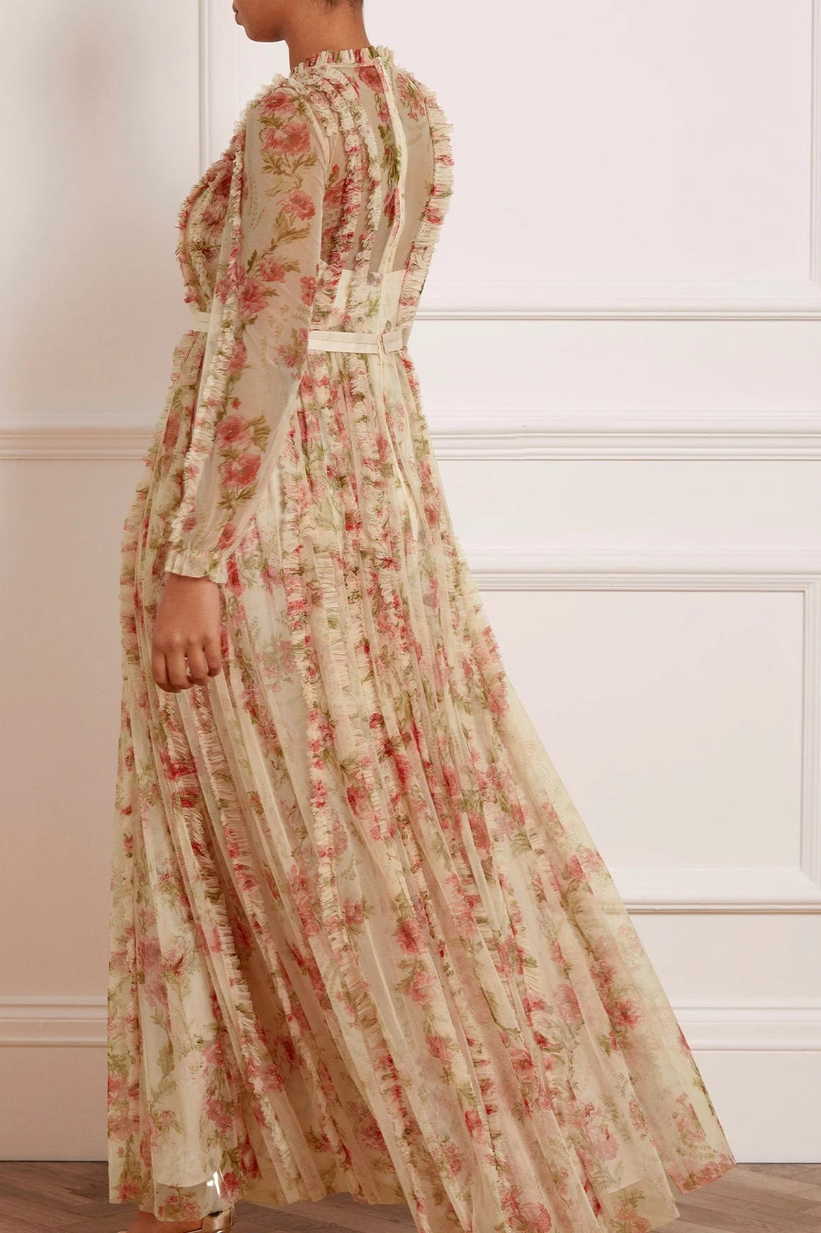 – Floral printed tulle decorated with printed tulle ruffles