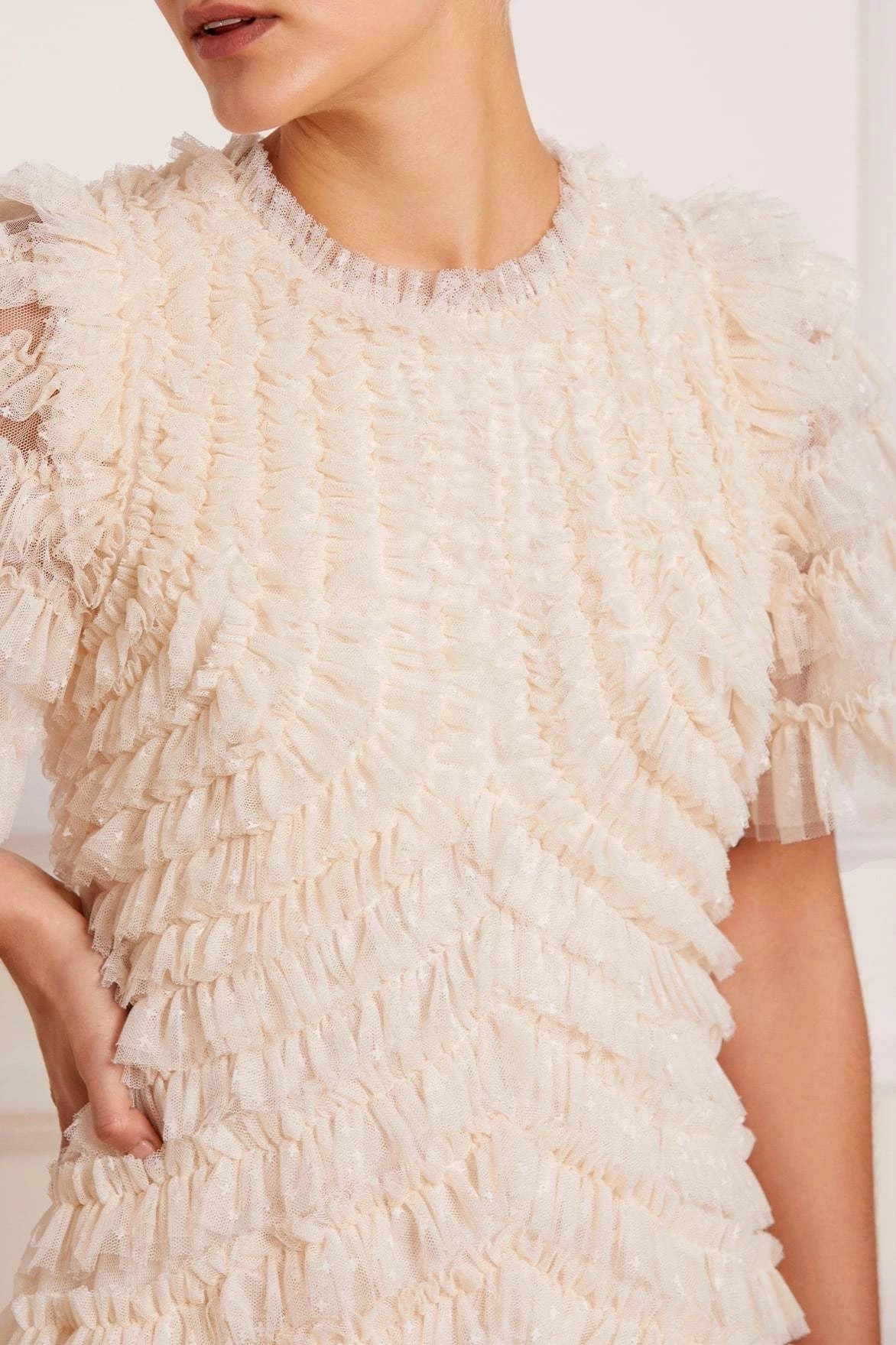 The Willow Ruffle Gown in Champagne. A Needle & Thread signature shape. This show-stopping gown is adorned with layers of tulle frills engineered to create a flattering texture. Developed from our kisses tulle, featuring an ‘x’ motif throughout. Make a statement in the Willow.