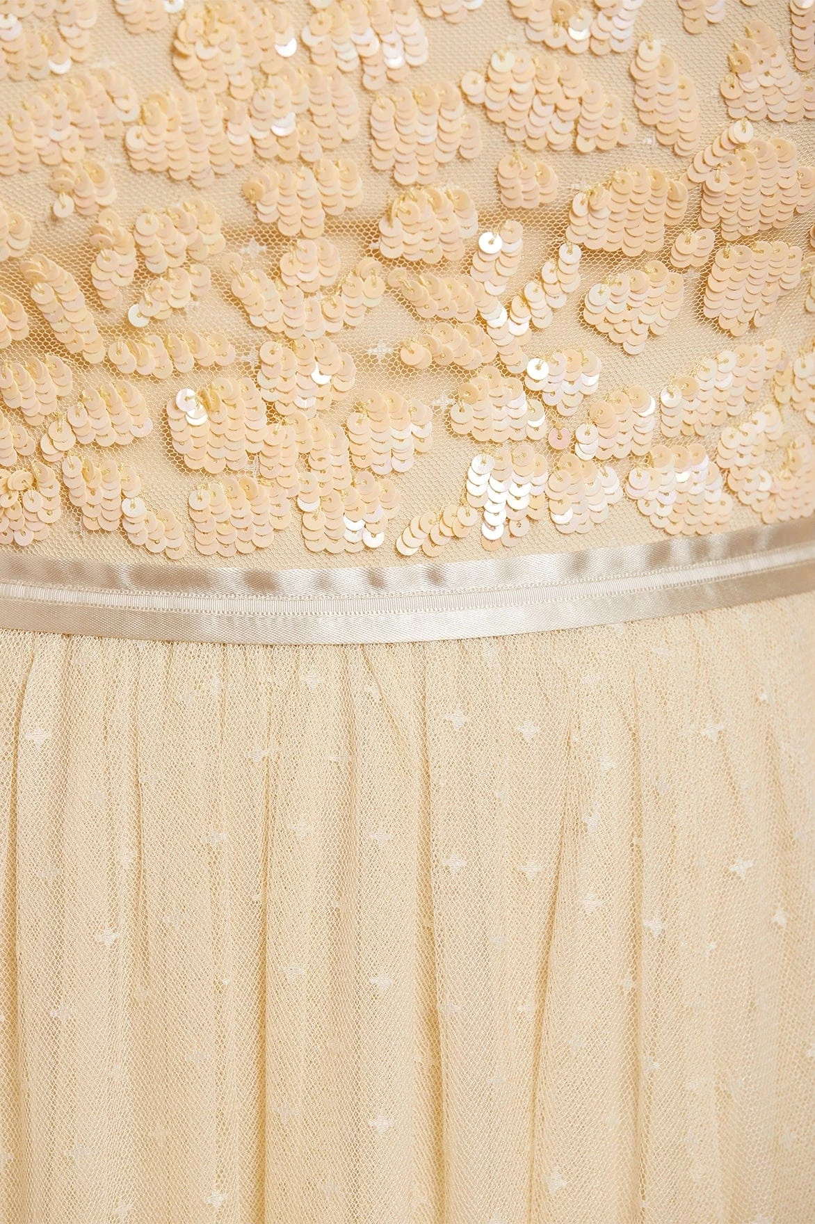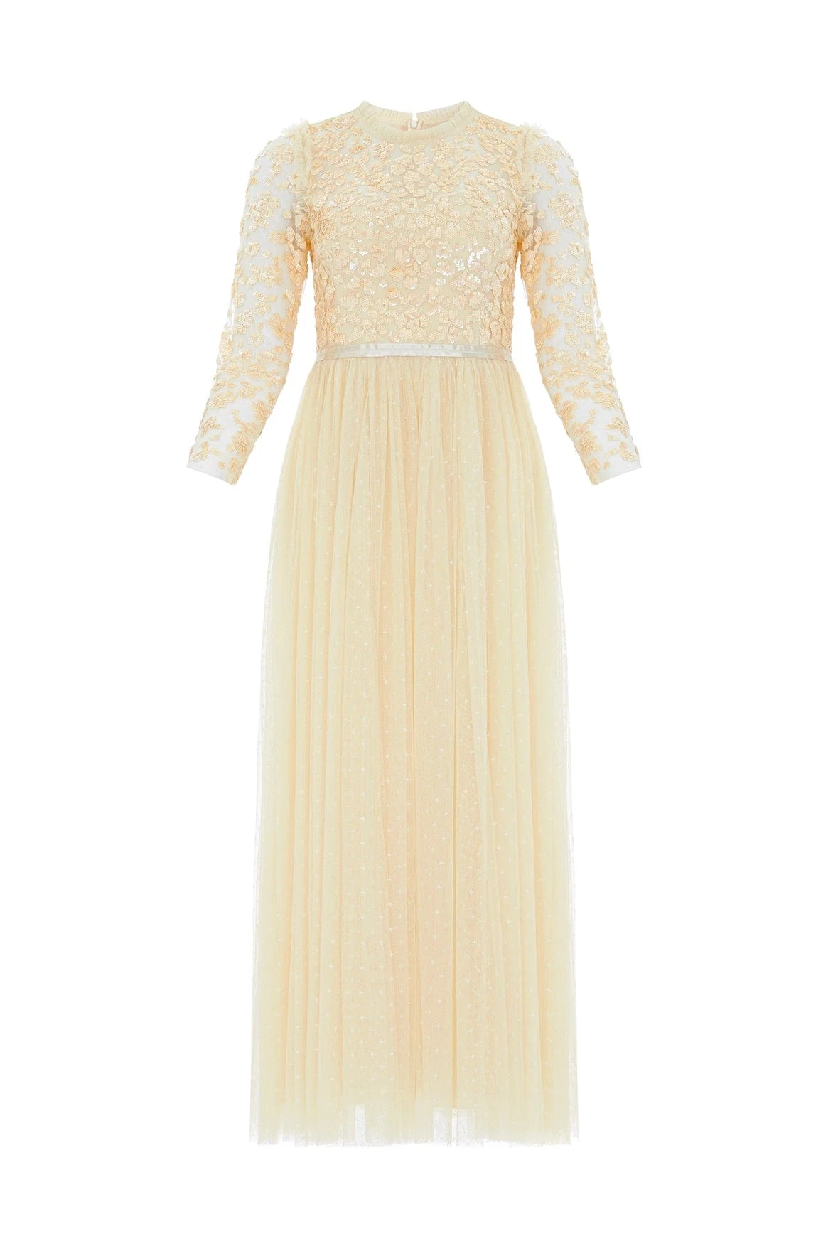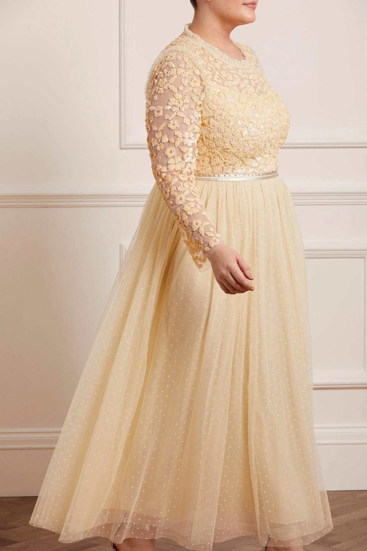 The Amalie Bodice Long Sleeve Ankle Gown in Buttercup. Featuring a bodice decorated with intricate shimmering sequins and floral motifs, this gown is designed with a layered tulle skirt featuring ‘x’ kiss motifs throughout, adding subtle texture. Make this gown your new season go-to.
