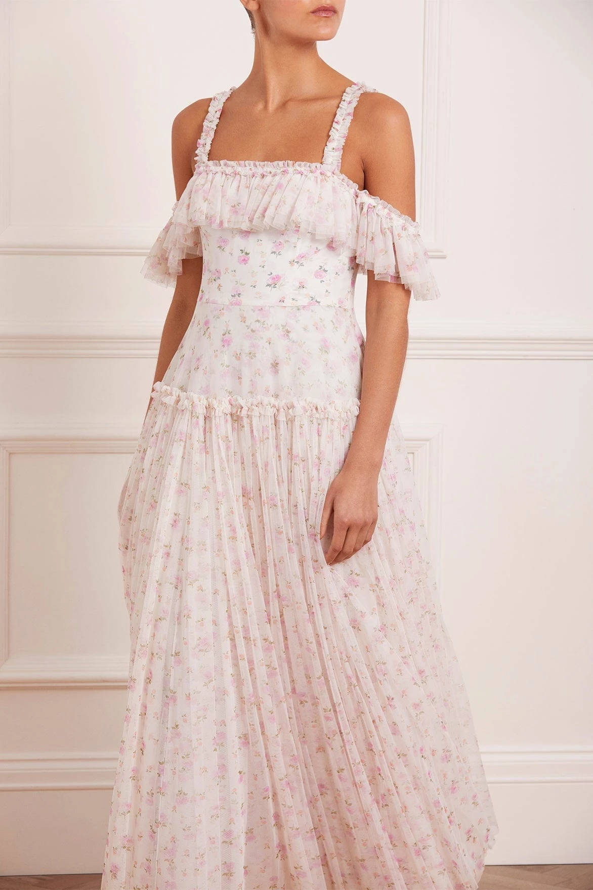 The Bijou Rose Off The Shoulder Ankle Gown in Moonshine / Wisteria. This cotton gown is decorated with a ditsy floral print scattered throughout. Designed beautifully with a tiered off the shoulder frill for flattering coverage, elasticated straps and a dramatic statement skirt. This gown is crafted with layers of soft tulle and a rigid net to create a pretty fairytale silhouette. Make a statement in this whimsical piece.