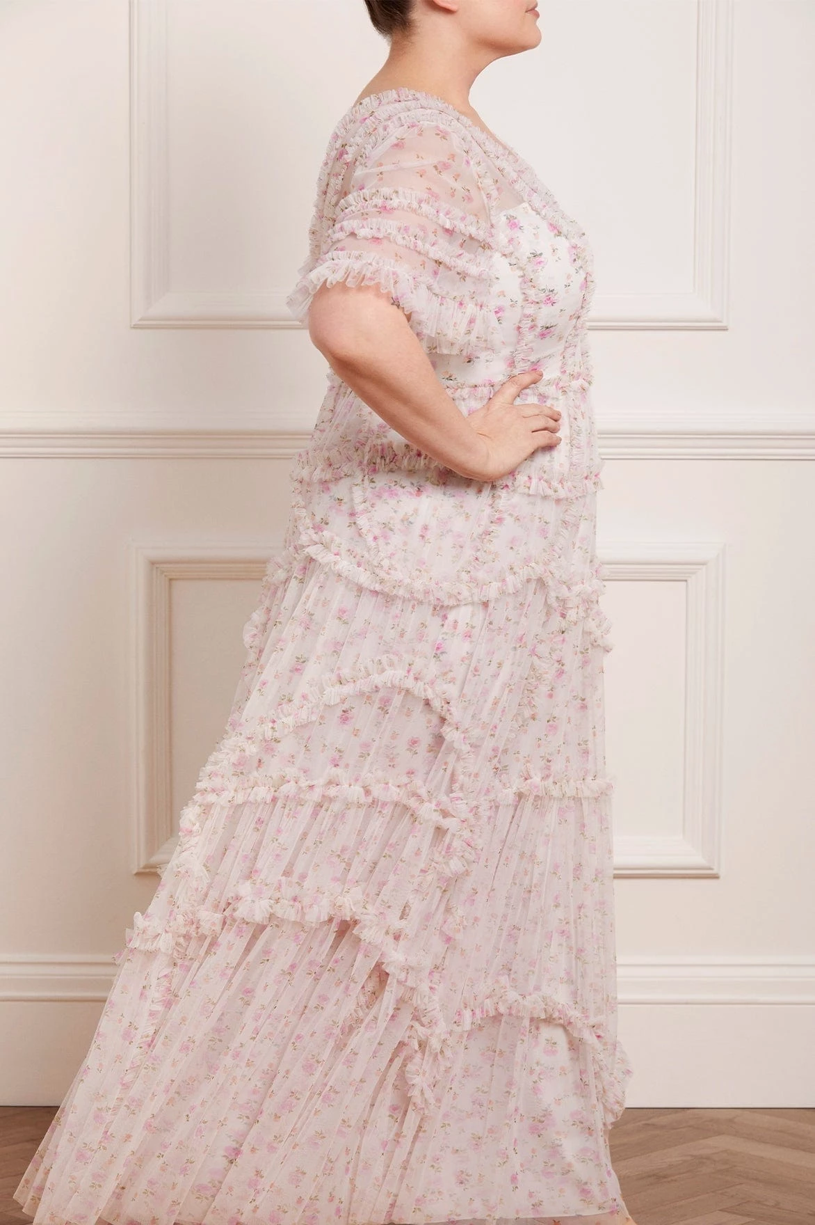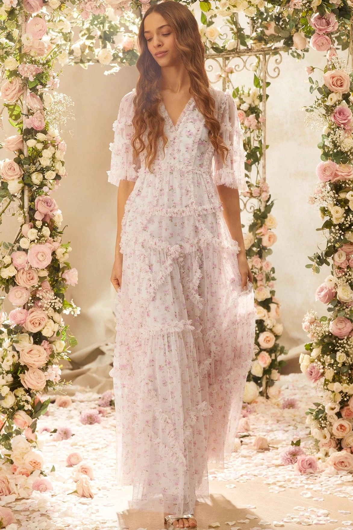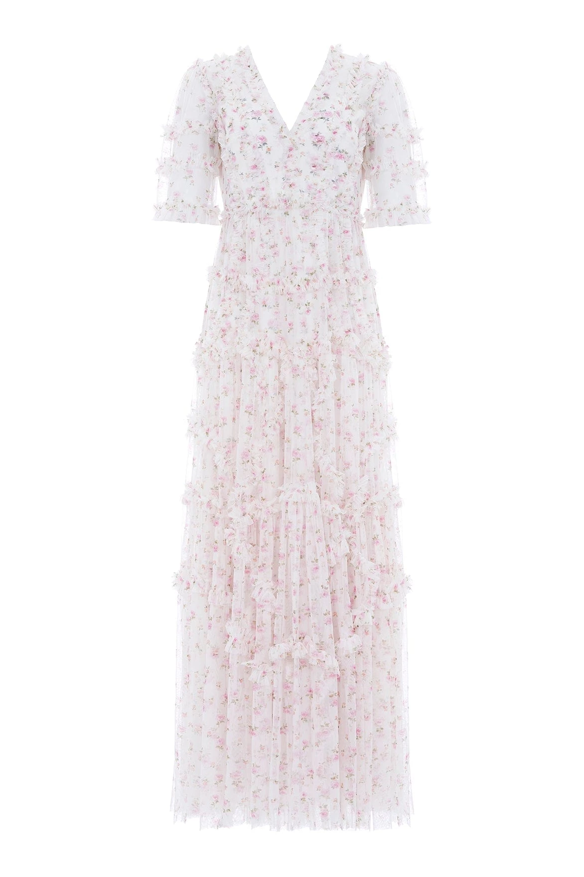 The Bijou Rose Ruffle Gown in Moonshine. This gown is decorated with a ditsy floral print scattered throughout. Designed beautifully with a V-neckline, ruffle trims and signature Needle & Thread detailing. The perfect gown to take you from day to night.